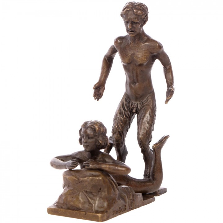 Le travail de cette sculpture bronze sensuelle révèle une patine antique maîtrisée. Les lignes de cette statuette corps féminin s'entremêlent harmonieusement avec la figure mythologique du faune. Cette figurine érotique transforme le mythe en art de vitrine.