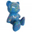 Chaque statuette ours résine est une pièce unique. Les projections multicolores explosent sur le fond bleu océan, créant des motifs spontanés qui évoquent un récif corallien vibrant de vie. La position assise de l'ours offre une toile parfaite pour cette composition marine contemporaine.