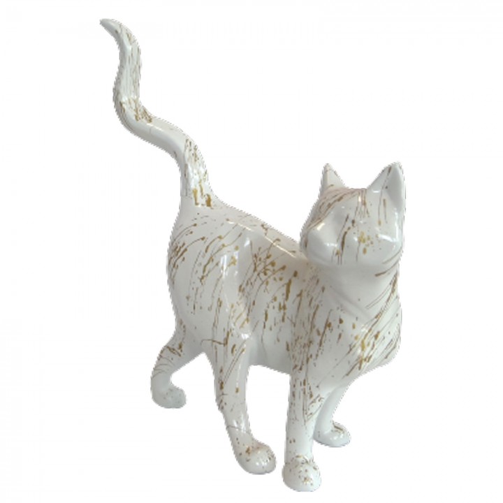 Cette statue décorative en résine aux projections dorées et multicolores sur fond blanc immaculé aux dimensions de H. 50 x L. 40 x l. 17 cm et son poids de 1.7 kg. Notre sculpture d'art et objet de décoration transforme le félin à la queue en S en une création unique peinte à la main.