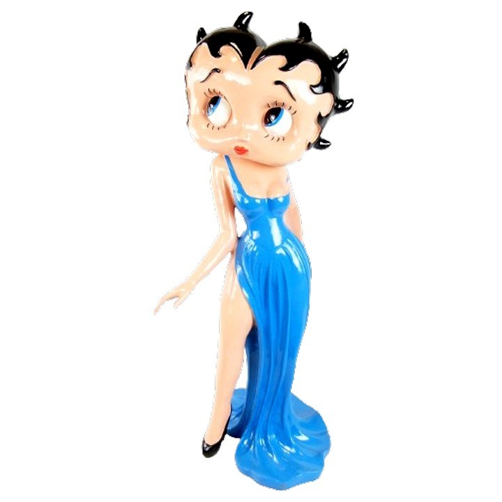 Cette statue en résine monumentale de Betty Boop en robe de soirée bleu ciel aux dimensions impressionnantes de H. 95 x L. 36 x l. 36 cm et son poids de 6 kg. Une pièce exceptionnelle qui évoque la légèreté d'un ciel d'été.
