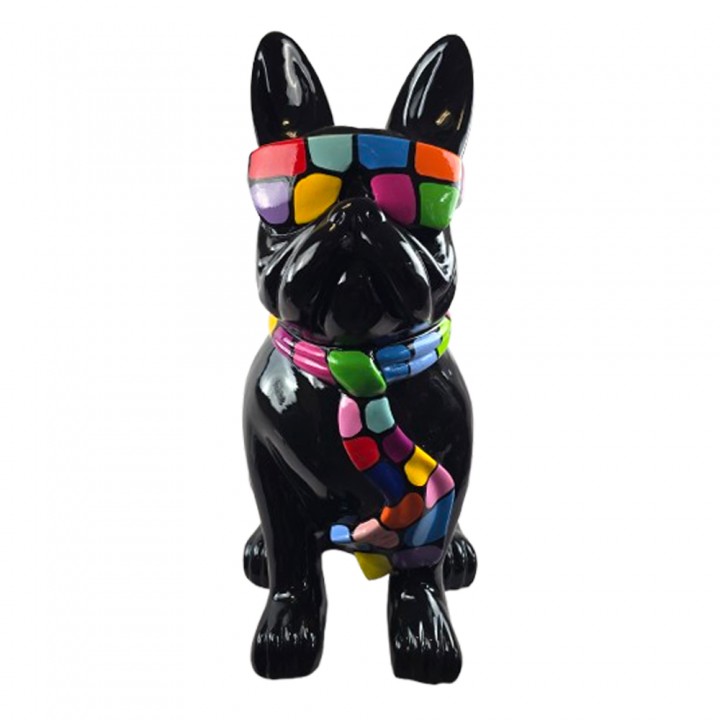 Statue bouledogue 80 cm résine noire lunettes multicolores peint main. Création unique collection art contemporain, galerie design, intérieur avant-gardiste. Exemplaire unique. 5 kg massif. Expédition sécurisée offerte France.