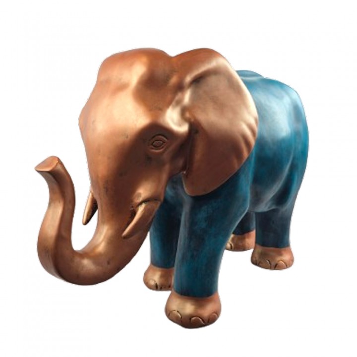 Statue éléphant résine bleu turquoise corps avec tête trompe et pattes cuivre antique