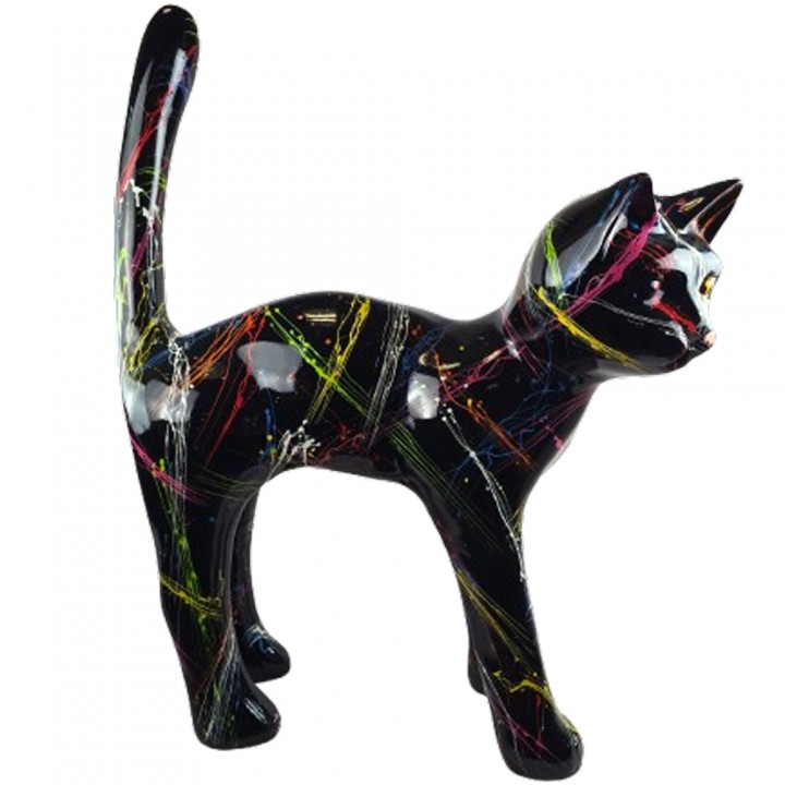 Statue chat résine noir laqué éclaboussures multicolores dynamiques queue verticale