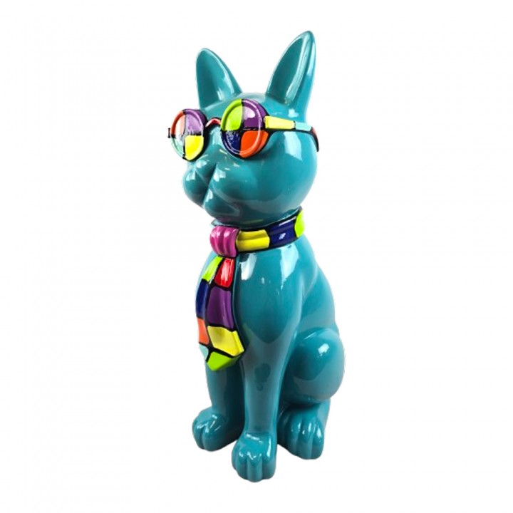 Figurine moderne représentant un chat turquoise coiffé de lunettes multicolores et d’une cravate assortie. Hauteur 60 cm, résine brillante et résistante. Une pièce décorative pleine de caractère, idéale en intérieur comme en extérieur.
