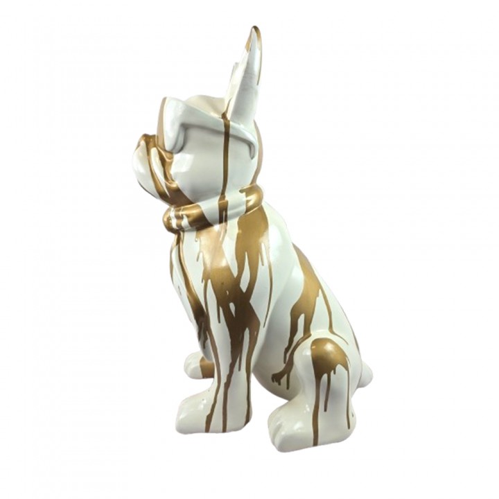 Sculpture de bouledogue assis en résine blanche avec coulures dorées. Hauteur 60 cm, format imposant et stable. Une pièce décorative moderne adaptée au salon, à la terrasse ou à un jardin contemporain.