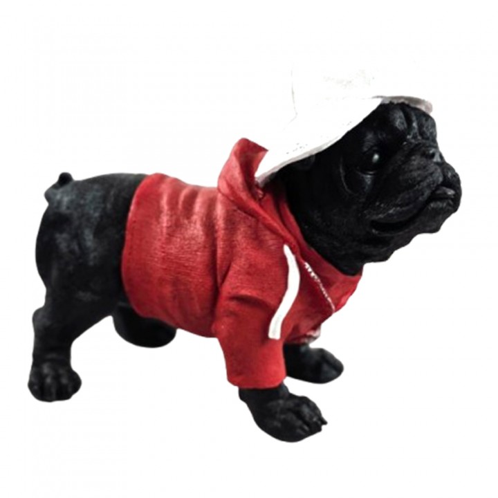 Cette figurine en résine affiche une finition noire mate sur le chien, contrastée par un hoodie rouge sculpté avec un effet textile. La casquette blanche ajoute une touche streetwear. L’ensemble forme un objet décoratif moderne qui s’intègre parfaitement dans une décoration urbaine ou décontractée.