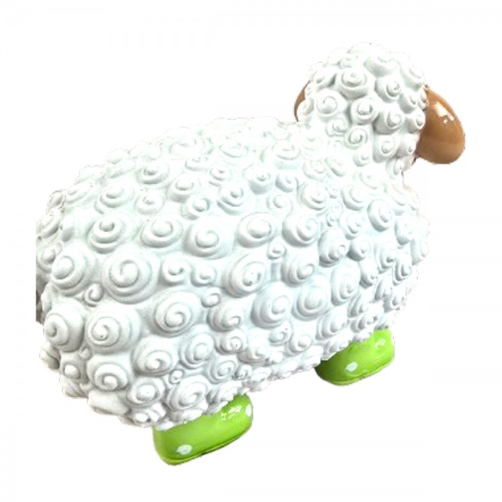 Cette figurine mouton marie pelage blanc texturé et tête beige lustrée avec bottes vert pomme à pois blancs originales. Format 23 cm idéal rebords fenêtres terrasses massifs floraux. Relief spiralé prononcé couvre surface corporelle. Résine résiste UV, gel, pluie sans altération couleurs. Accessoire décoratif polyvalent illuminant intérieur extérieur fraîcheur printanière intemporelle.