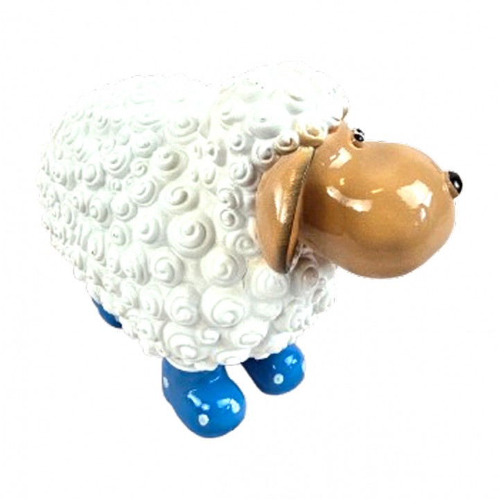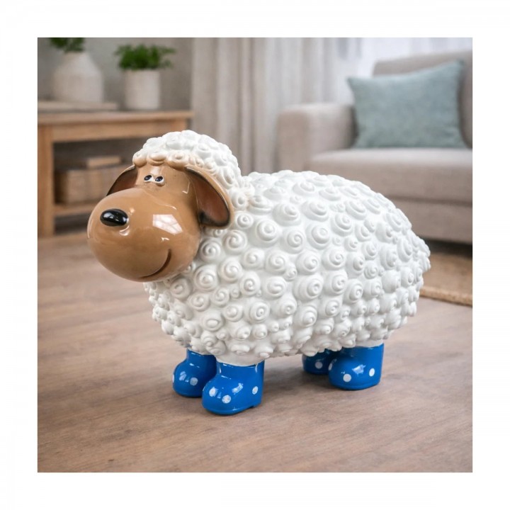 Cette sculpture mouton associe pelage blanc texturé et tête beige brillante avec bottes bleues à pois blancs originales. Dimensions 23 cm parfaites tables consoles jardins balcons. Texture spiralée relief couvre surface créant profondeur tactile. Résine supporte UV, gel, pluie sans altération. Ornement polyvalent apportant élégance maritime contemporaine espaces intérieurs extérieurs.
