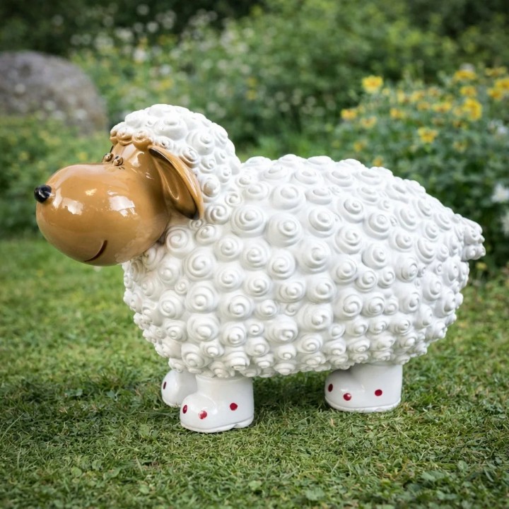 Cette figurine mouton allie pelage blanc texturé et tête beige lustrée avec pattes blanches à pois rouges originales. Dimensions 23 cm idéales consoles étagères balcons jardins. Texture spiralée relief structure surface entière. Résine résiste UV, gel, pluie sans altération. Ornement polyvalent apportant touche ludique contemporaine espaces intérieurs extérieurs toute année.