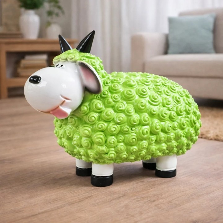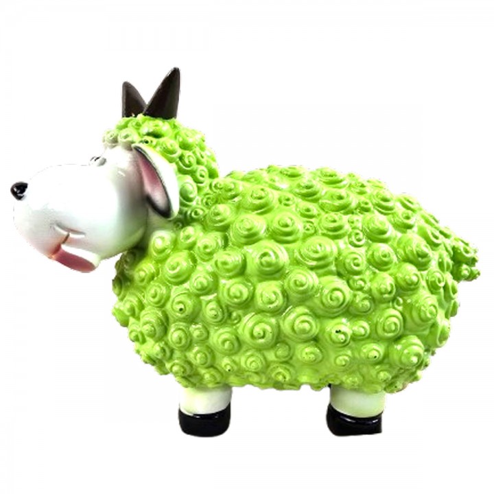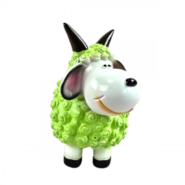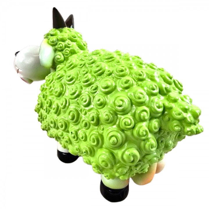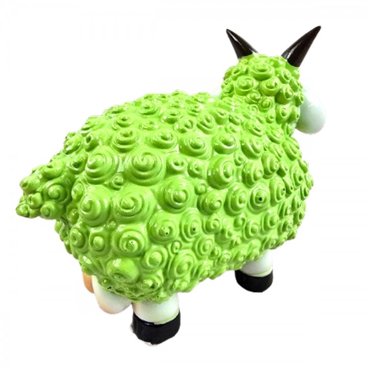 Cette sculpture mouton allie pelage vert pomme vif et tête blanche brillante avec cornes noires droites originales. Dimensions 23 cm conviennent parfaitement étagères buffets jardins potagers. Texture spiralée relief structure surface corporelle entière. Résine supporte UV, gel, pluie sans dégradation. Ornement décoratif apportant vitalité végétale contemporaine espaces intérieurs extérieurs.