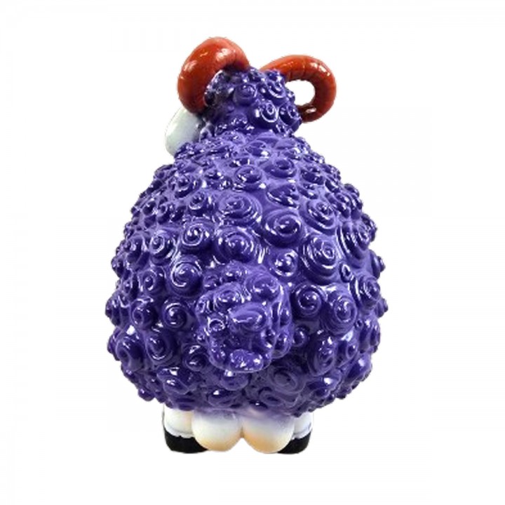 Pelage violet spiralé couvre corps créant texture relief prononcé. Tête blanche contraste avec corps violet créant harmonie élégante. Cornes spiralées rayées ajoutent caractère bélier majestueux puissant.