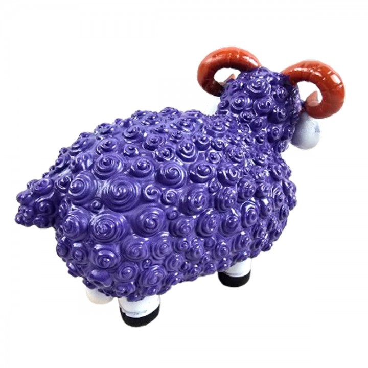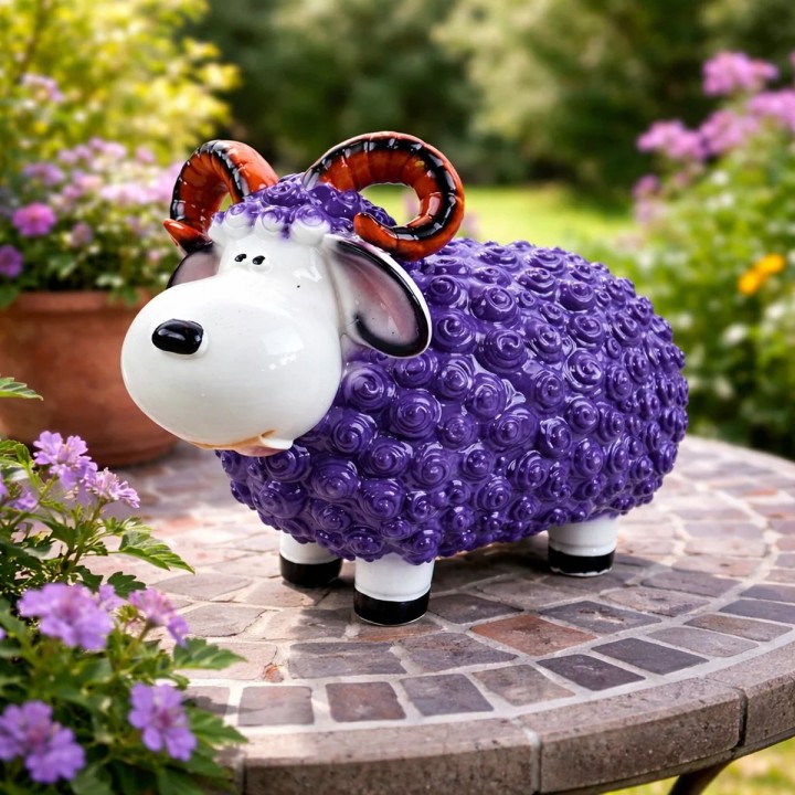 Cette sculpture mouton associe pelage violet profond et tête blanche lustrée avec cornes spiralées rayées noires majestueuses. Format 23 cm convient consoles buffets jardins terrasses. Texture spiralée relief structure surface corporelle entièrement. Résine résiste UV, gel, pluie sans dégradation. Ornement décoratif apportant élégance raffinée espaces intérieurs extérieurs saison.
