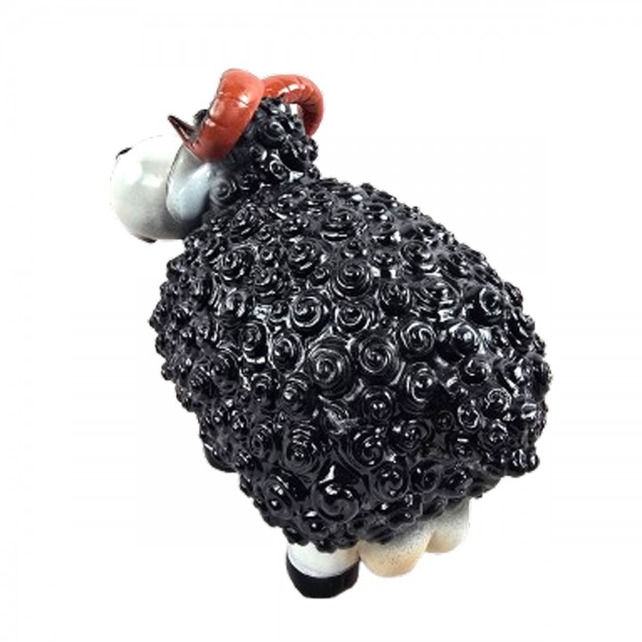 Pelage noir spiralé couvre corps créant texture relief prononcé. Tête blanche contraste avec corps noir créant harmonie graphique. Cornes spiralées rayées ajoutent caractère bélier majestueux puissant.