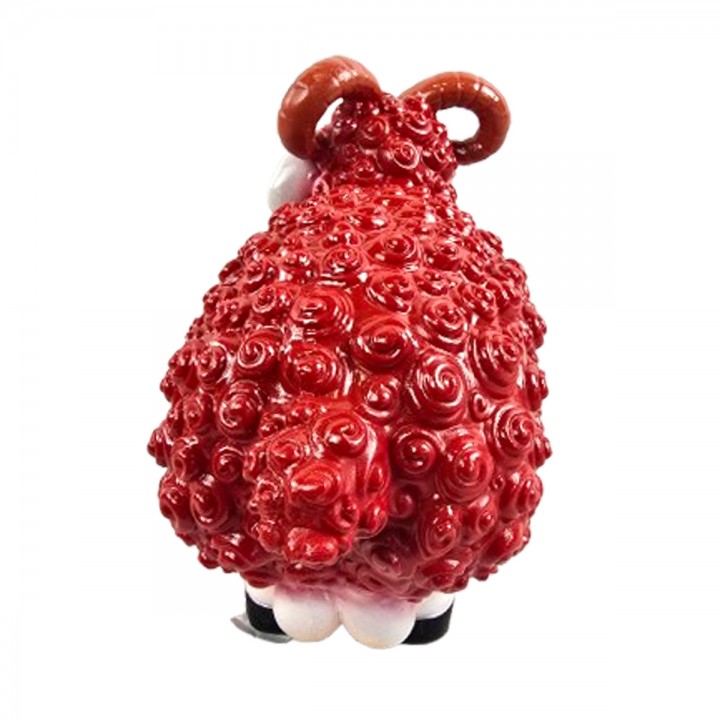 Pelage bordeaux spiralé couvre corps créant texture relief prononcé. Tête blanche contraste avec corps bordeaux créant harmonie noble. Cornes spiralées rayées ajoutent caractère bélier majestueux puissant.