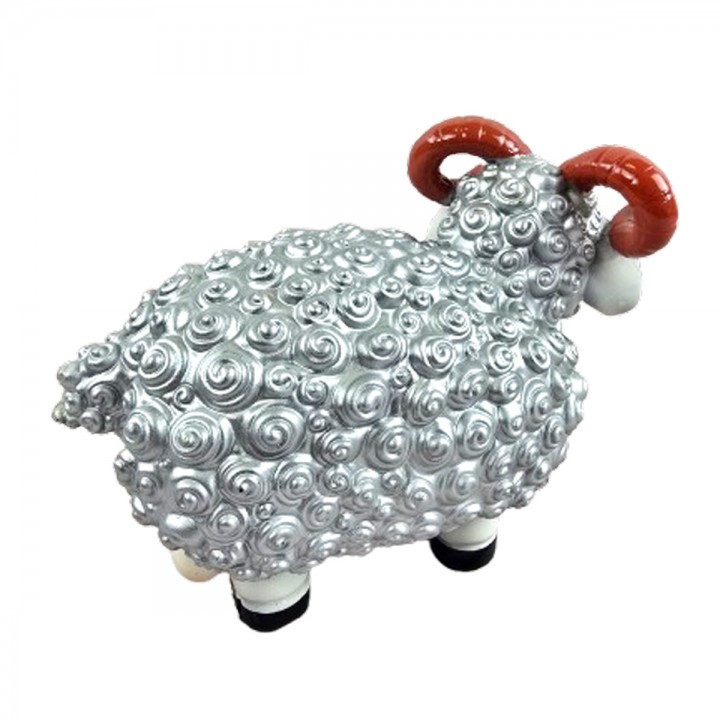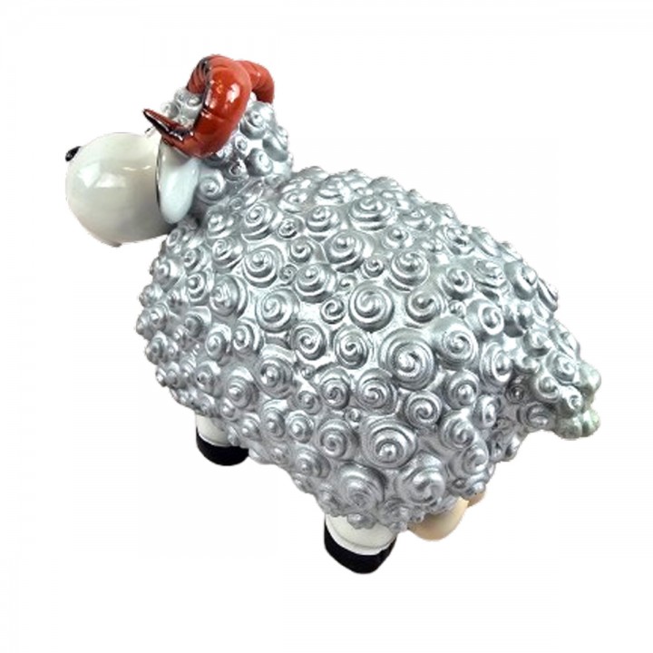 Cette sculpture mouton associe pelage argenté métallisé et tête blanche lustrée avec cornes spiralées rayées noires majestueuses. Format 23 cm convient consoles buffets jardins terrasses. Texture spiralée relief structure surface corporelle entièrement. Résine résiste UV, gel, pluie sans dégradation. Ornement décoratif apportant élégance métallique espaces intérieurs extérieurs saison.