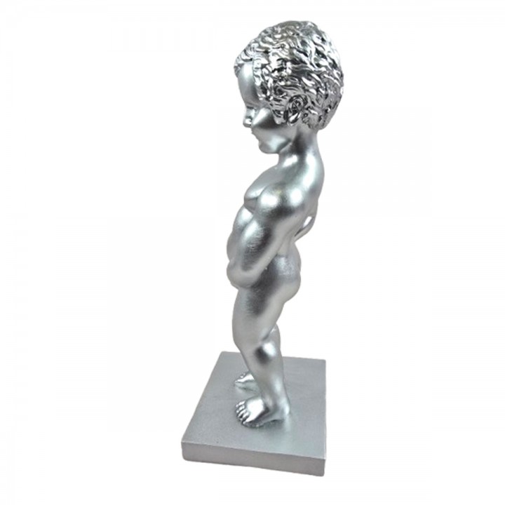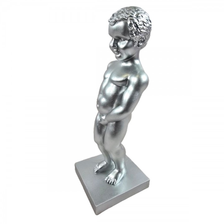 Cette pièce décorative inspirée du célèbre Manneken Pis affiche une finition argentée brillante. Dimensions : H 35 x L 14 x l 11 cm, poids 0.7 kg. Fabriquée en résine dense, cette statuette s'installe en intérieur comme en extérieur. Son éclat argenté apporte luminosité et modernité à vos compositions décoratives.