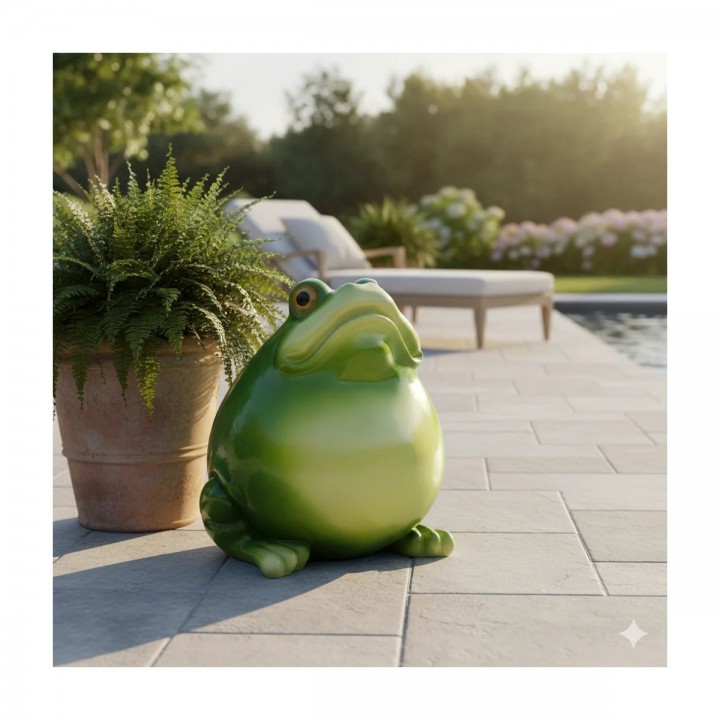 Mare naturelle végétalisée roseaux iris intègre harmonieusement cette sculpture réaliste échelle. Piscine naturelle filtrée plantes accepte volontiers cet accessoire déco ludique margelles bois. Jardin d'eau contemporain géométrique valorise formes arrondies grenouille par contraste architectural.