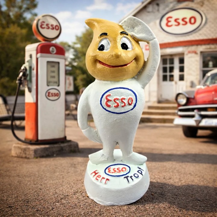 Vitrine dédiée objets publicitaires pétroliers anciens met en valeur cette statuette entre plaques émaillées. Cabinet curiosités automobilia moderne accueille cette pièce parmi bidons huile vintage et outils anciens. Étagère murale garage thématique trouve dans cet ornement un point focal vertical.