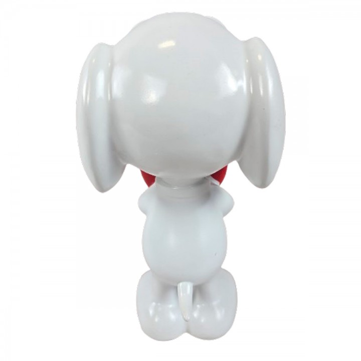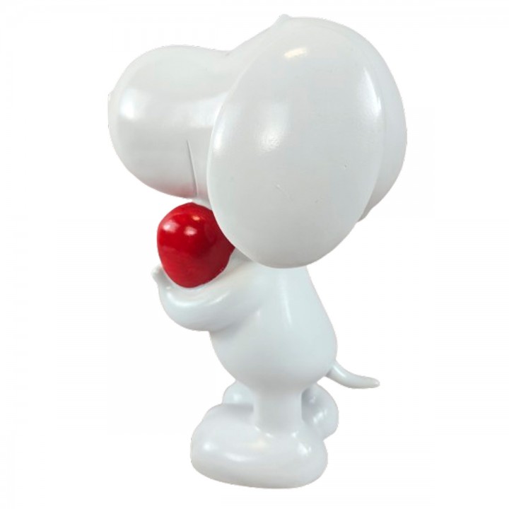 Oreilles tombantes caractéristiques sculptées relief naturaliste ajoutent expressivité reconnaissable identifiable. Cœur rouge tenu délicatement pattes symbolise fidélité affection canine thème central Peanuts. Posture debout bras levés tenant cœur confère dynamisme émotionnel présence attachante.
