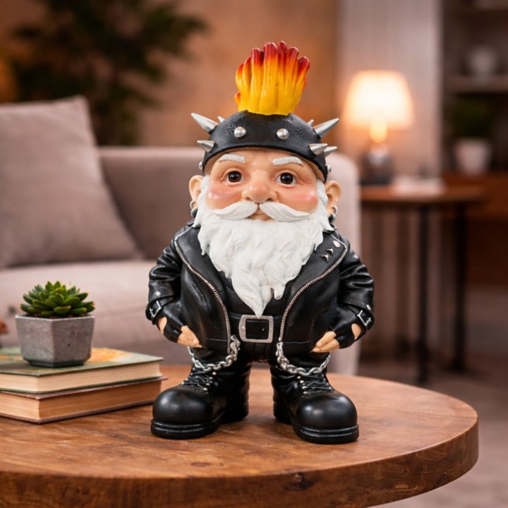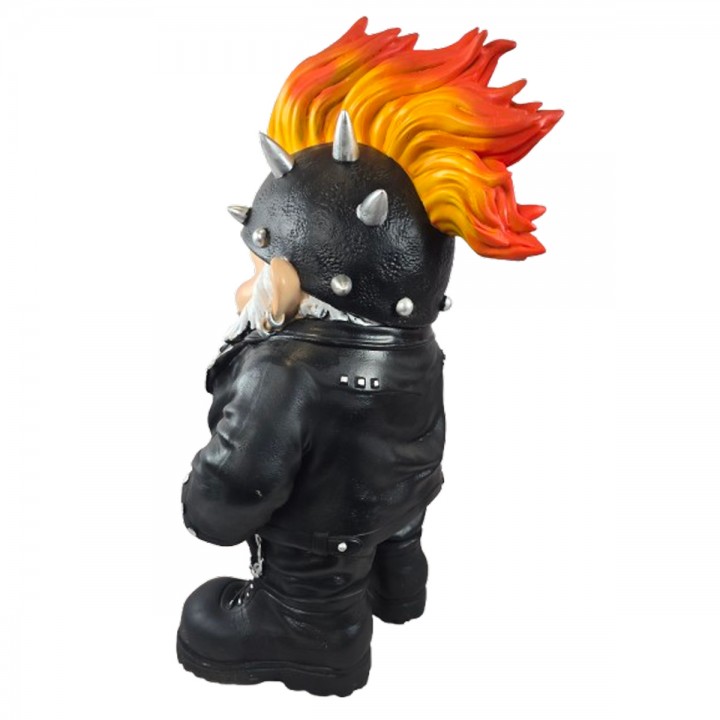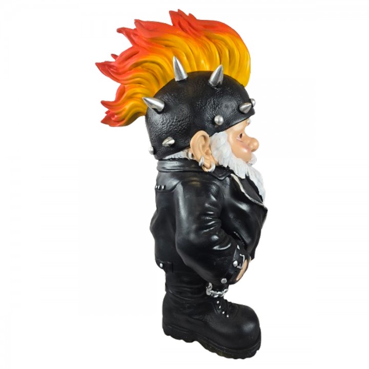 Cette figurine format intermédiaire revisite nain jardin univers punk rock rebelle spectaculaire. Dimensions : H 40 x L 23 x l 22 cm, poids 1.5 kg. Réalisée en résine robuste, cette pièce affiche casque cuir pics argentés, crête flammes rouge-jaune verticale, barbe blanche imposante et veste perfecto noire détaillée. Ornement polyvalent trouve sa place jardins intérieurs.