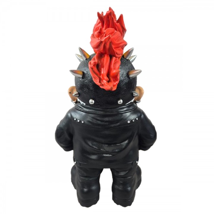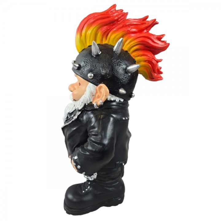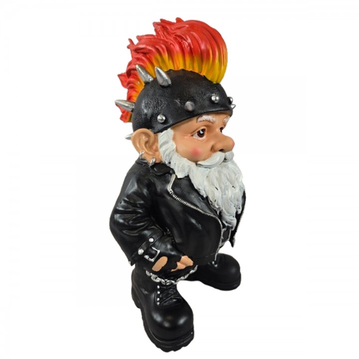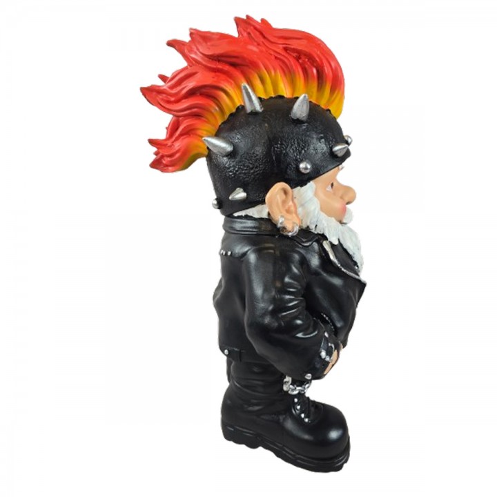 Cette figurine XXL monumentale revisite nain jardin univers punk rock format spectaculaire imposant. Dimensions : H 70 x L 43 x l 35 cm, poids 3.5 kg. Réalisée en résine armée robuste, cette pièce géante affiche casque cuir pics argentés, crête flammes dégradé rouge-jaune, barbe blanche volumineuse et perfecto noir. Ornement monumental trouve sa place grands jardins espaces.