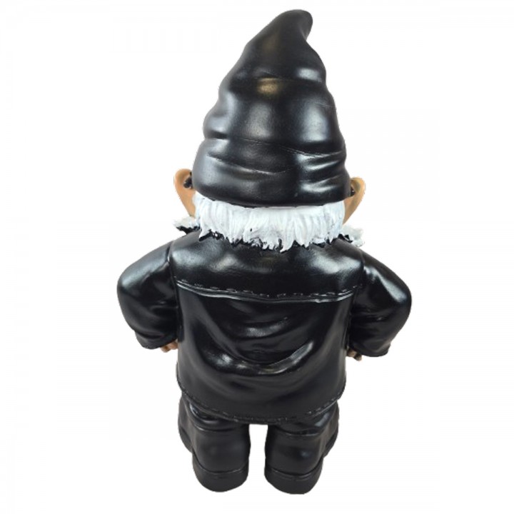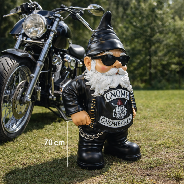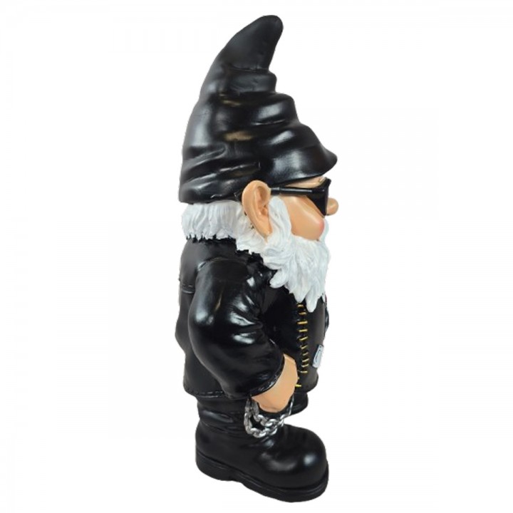 Cette statuette décorative mesure 70 centimètres de hauteur, 44 centimètres de largeur et 25 centimètres de profondeur, pour un poids de 3,5 kilogrammes. Le nain de jardin biker présente un style motard affirmé avec sa veste en cuir noir ornée de l'inscription Gnome Cruising. La sculpture arbore des lunettes de soleil rondes, une barbe blanche volumineuse et un bonnet pointu noir caractéristique. Une chaîne métallique complète l'allure rock de cette pièce décorative humoristique.