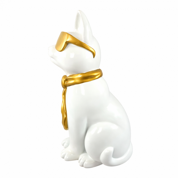 Cette statuette féline mesure 60 centimètres de hauteur, 33 centimètres de longueur et 30 centimètres de largeur, pour un poids de 3,5 kilogrammes. Le chat blanc se tient assis dans une posture élégante et distinguée. La sculpture arbore des lunettes dorées de style masque qui couvrent les yeux et une cravate dorée nouée avec soin. Le contraste entre le blanc immaculé du corps et les accents dorés des accessoires crée un impact visuel remarquable.