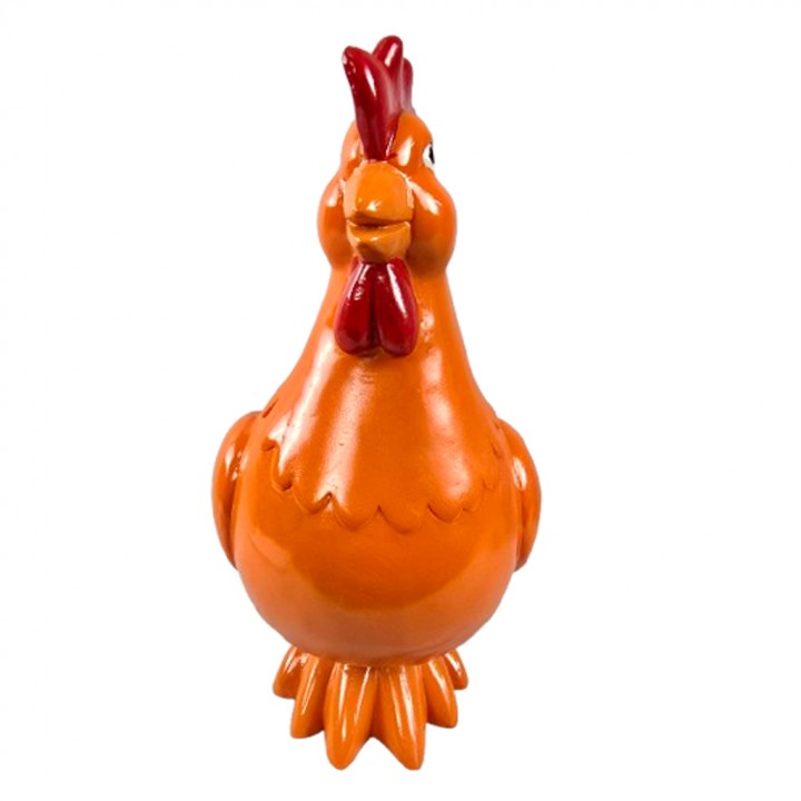 Cette sculpture aviaire mesure 40 centimètres de hauteur, 30 centimètres de longueur et 20 centimètres de largeur, pour un poids de 1,5 kilogramme. L'ensemble présente une teinte orange intense du corps jusqu'aux pattes. La crête rouge imposante couronne la tête avec un modelé réaliste. Le bec orange s'harmonise parfaitement avec le plumage. Les griffes orange sculptées offrent un ancrage stable au sol.