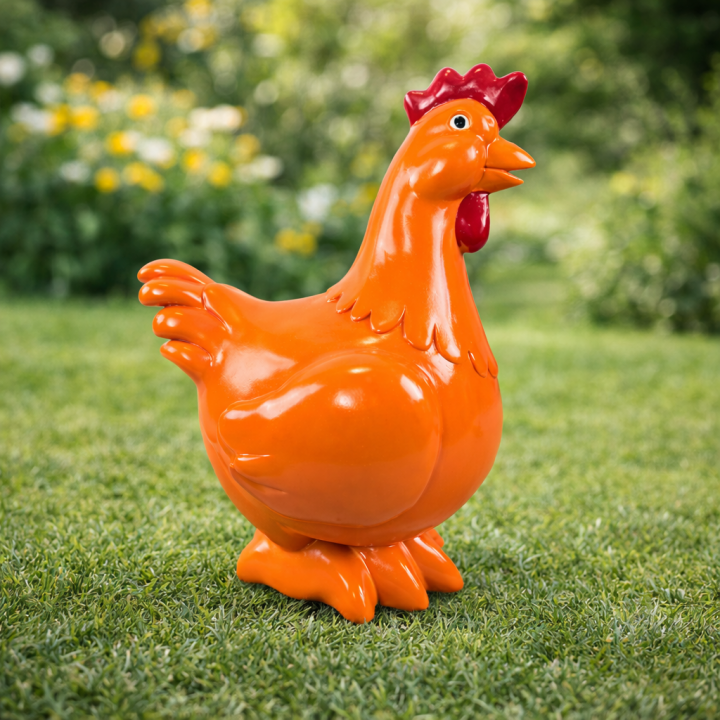 Le carré potager constitue le cadre idéal pour valoriser ce gallinacé orange. Positionnez-le au milieu des plantations ou contre une clôture basse. La cour intérieure accueille cette statue comme symbole de la basse-cour. Un parterre de fleurs aux tons chauds sublime la teinte orange vive.