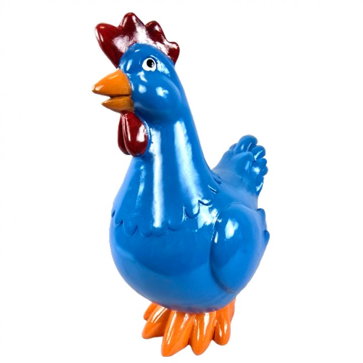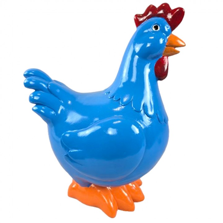 Ce gallinacé au bleu éclatant apporte une touche contemporaine à votre décoration. Dimensions : H40 x L30 x l20 cm, poids 1,5 kg. Corps bleu azur brillant, crête rouge généreuse, bec orange et pattes orange vif. Résine performante pour usage intérieur et extérieur.