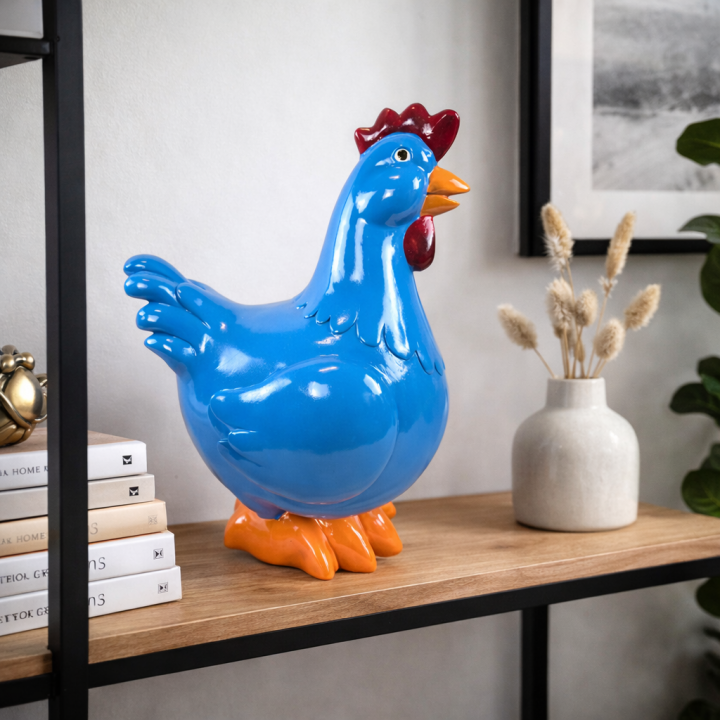 Cette figurine aviaire mesure 40 centimètres de hauteur, 30 centimètres de longueur et 20 centimètres de largeur, pour un poids de 1,5 kilogramme. Le corps affiche un bleu azur profond avec finition brillante. La crête rouge proéminente surmonte la tête avec des lobes bien définis. Le bec orange contraste harmonieusement avec le plumage bleu. Les pattes orange à griffes sculptées assurent une assise ferme.