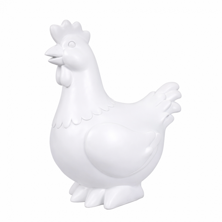 Cette poule blanche sublime un salon scandinave aux tons clairs et lignes simples. Positionnez la sculpture sur une étagère ouverte ou table basse épurée. L'objet s'intègre naturellement dans une entrée minimaliste aux murs blancs. Un espace de travail contemporain gagne en caractère avec cette présence discrète.