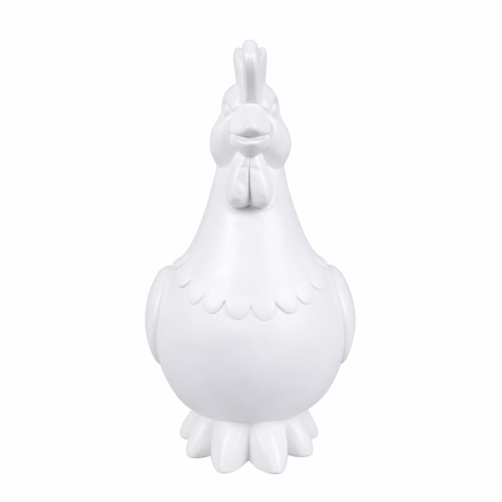 Cette sculpture aviaire mesure 40 centimètres de hauteur, 30 centimètres de longueur et 20 centimètres de largeur, pour un poids de 1,5 kilogramme. L'intégralité de la pièce arbore un blanc uniforme. La crête, le bec, les barbillons et les pattes présentent la même teinte immaculée. Cette monochromie totale crée une esthétique minimaliste raffinée.