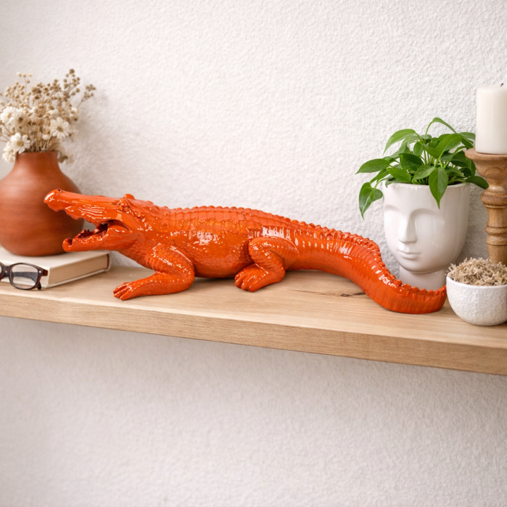 Ce crocodile orange dynamise un séjour aux couleurs neutres recherchant une touche audacieuse. Positionnez la sculpture sur une console graphique ou étagère design. L'objet s'harmonise parfaitement dans un bureau créatif aux tons vifs. Un espace contemporain aux influences industrielles s'enrichit de cette présence reptilienne.