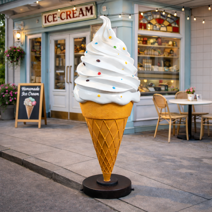 Les glaciers artisanaux français proposant des parfums créatifs innovants profitent de cet attracteur visuel différenciant. L'ornement géant signale clairement le positionnement haut de gamme artisanal de l'établissement. Le trafic piéton capté génère des ventes additionnelles sur l'ensemble de la gamme produits saisonnière.