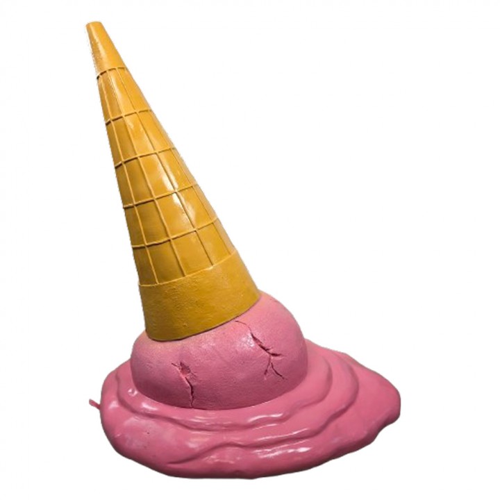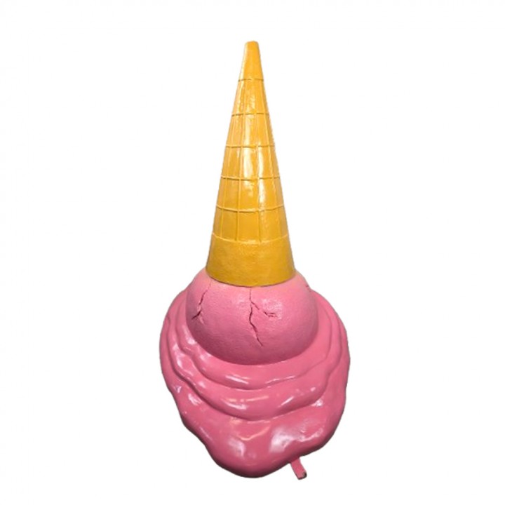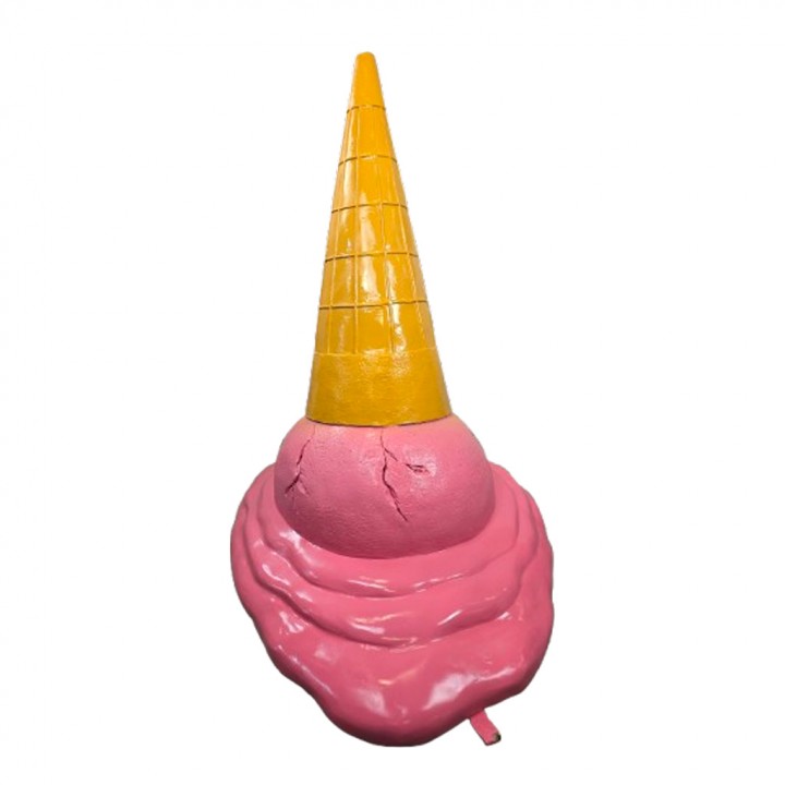 La boule rose fraise fissurée mesure environ 40 cm de diamètre simulant l'impact d'une chute réaliste. Le cornet gaufrette nervuré s'élève sur 60 cm avec quadrillage moulé en relief authentique. La flaque liquide étalée reproduit fidèlement l'aspect coulant d'une glace fondante crémeuse. L'ensemble dégage un réalisme saisissant amplifiant l'effet humoristique commercial.