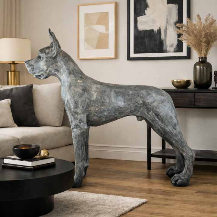 Ce n'est pas une simple figurine décorative. Cette statue dogue allemand en résine impose sa silhouette fière et musclée dès qu'on entre dans une pièce. L'effet béton ciré lui donne un caractère industriel et contemporain — parfait pour un loft, une entrée design ou un jardin paysager.