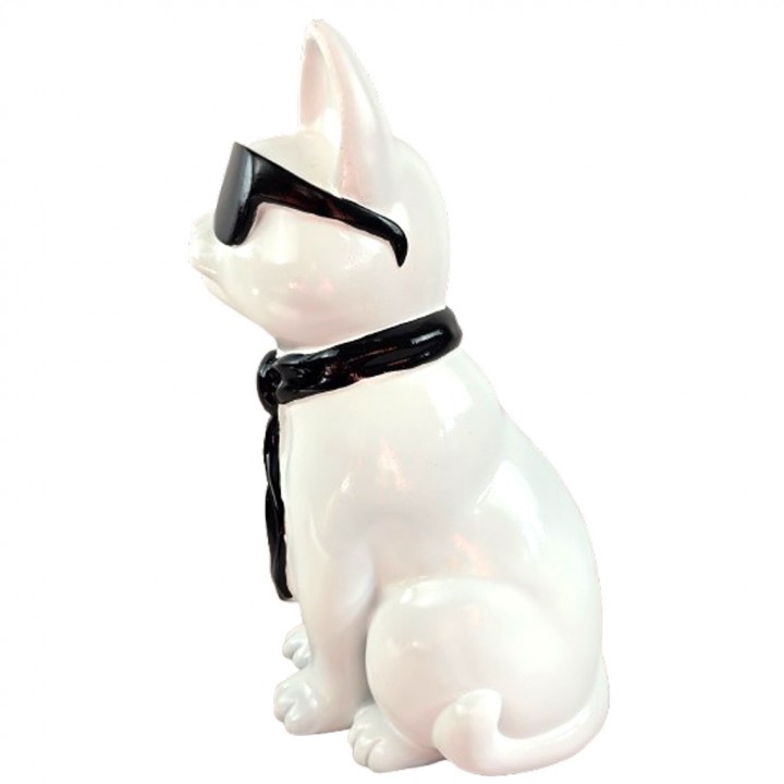 Lunettes noires, écharpe nouée avec élégance et posture assurée : cette statue chat en résine blanche affiche un style fashion immédiatement reconnaissable. Dimensions : H 40 x L 23 x l 20 cm, poids 2 kg. Finition laquée brillante, contraste blanc et noir saisissant. Figurine résine usage intérieur et extérieur, résiste gel et UV.