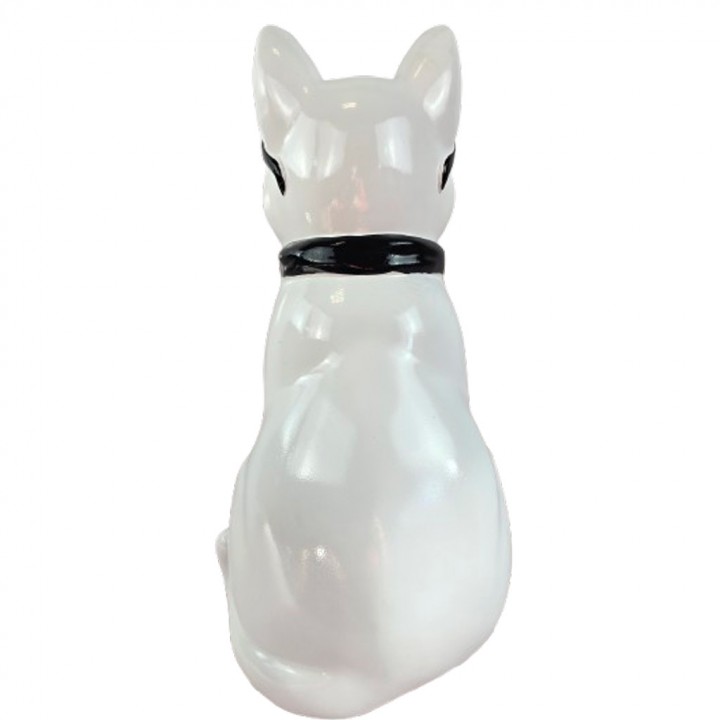 Cette statue chat avec lunettes en résine mesure 40 cm de hauteur, 23 cm de largeur et 20 cm de profondeur pour un poids de 2 kg. Le chat est représenté assis, posture frontale droite, regard mystérieux dissimulé derrière les verres noirs brillants. La silhouette épurée aux formes arrondies est mise en valeur par la finition laquée blanc nacré. L'écharpe noire sculptée en relief descend sur le poitrail et complète l'ensemble. Cette statue chat design est idéale pour une décoration intérieure moderne, apportant une touche fashion et originale à n'importe quel espace.