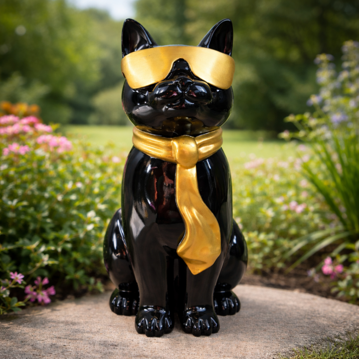Noir laqué brillant, lunettes dorées et écharpe or : cette statue chat en résine noire dégage un style luxe et décalé immédiatement saisissant. Dimensions : H 40 x L 23 x l 20 cm, poids 2 kg. Finition laquée haute brillance, contraste noir et or spectaculaire. Figurine résine usage intérieur et extérieur protégé, résiste gel et UV.