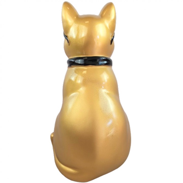 Cette statue chat en résine dorée mesure 30 cm de hauteur pour 16 cm de largeur et 15 cm de profondeur. Poids : 1,2 kg — stabilité garantie sur toute surface plane, sans fixation. La finition dorée métallisée enveloppe uniformément la silhouette du félin, des oreilles pointues jusqu'aux pattes avant.