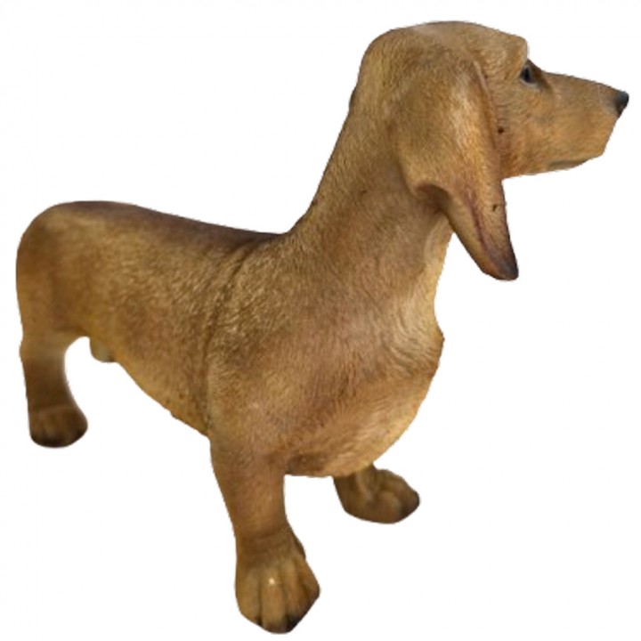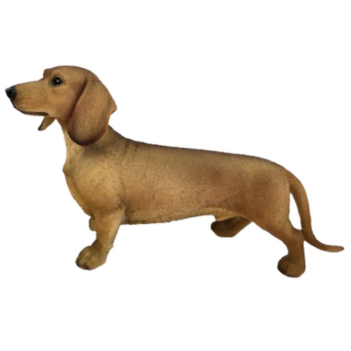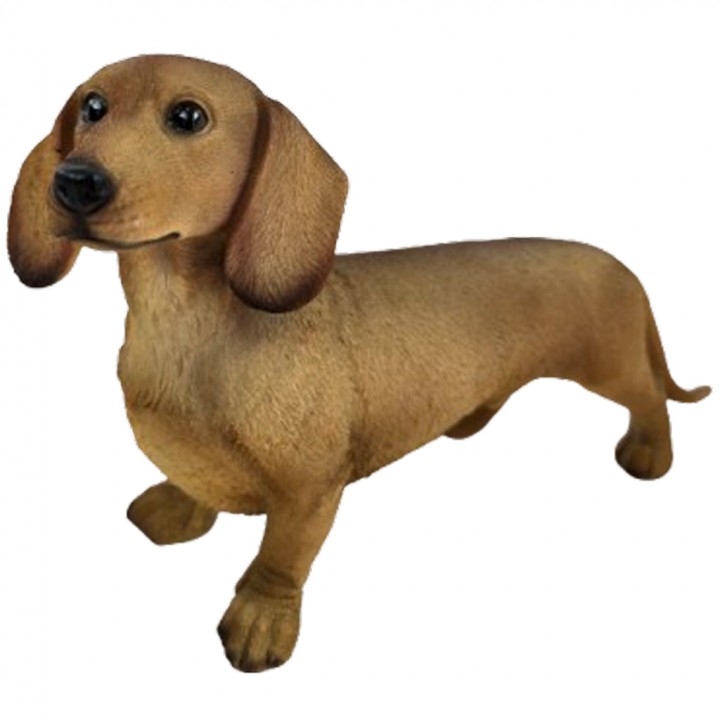 Quatre pattes au sol, regard vif, oreilles tombantes — ce teckel debout en résine fauve dégage cette sérénité confiante propre à la race. Pas d'agitation, juste une présence tranquille et naturelle.