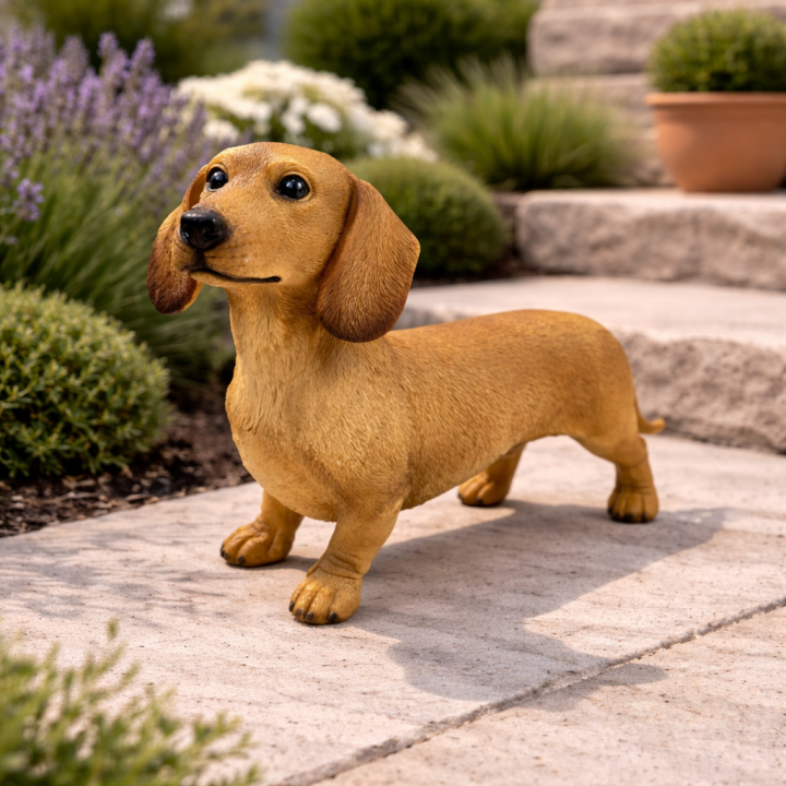 Peut-on associer plusieurs modèles de teckels ensemble ? Oui — la gamme propose quatre modèles complémentaires : debout fauve, debout noir et feu, assis fauve, assis noir et feu. Un groupe de deux ou trois pièces crée une mise en scène animalière très efficace.