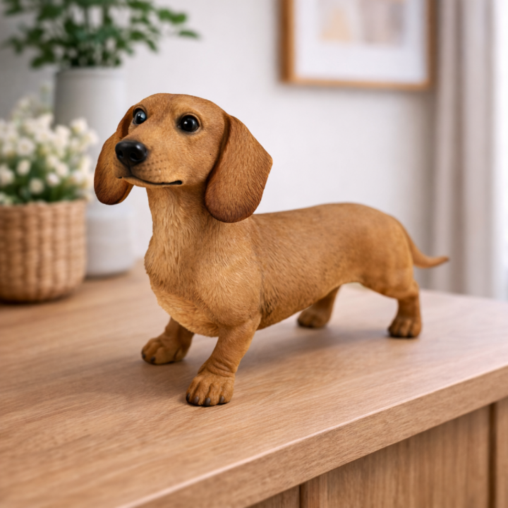 Sur le sol d'une entrée, il accueille sans en faire trop — une présence douce qui met à l'aise. Posée sur un meuble bas en chêne ou en pin, la statuette teckel fauve dialogue naturellement avec les tons chauds du bois. Dans un salon campagne, une cuisine rustique ou une bibliothèque, cette pièce décorative chien réaliste s'intègre comme un membre discret de la maison.