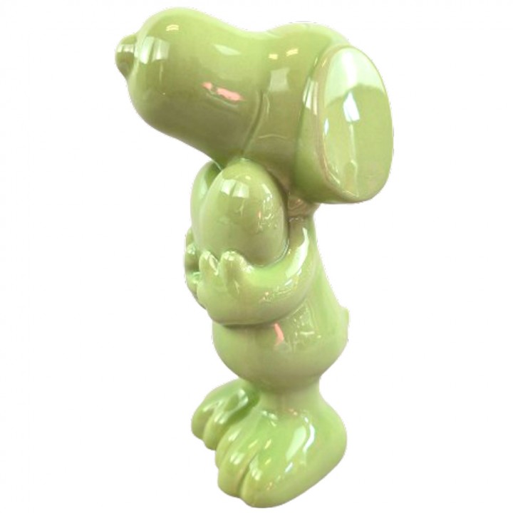Le vert tendre qui rafraîchit sans brusquer. Cette statuette céramique Snoopy verte vernissée tient un cœur à deux pattes et apporte une touche végétale lumineuse dans votre intérieur. 20 cm de hauteur, 0,5 kg. Un objet de décoration intérieur en céramique original, doux et naturel.
