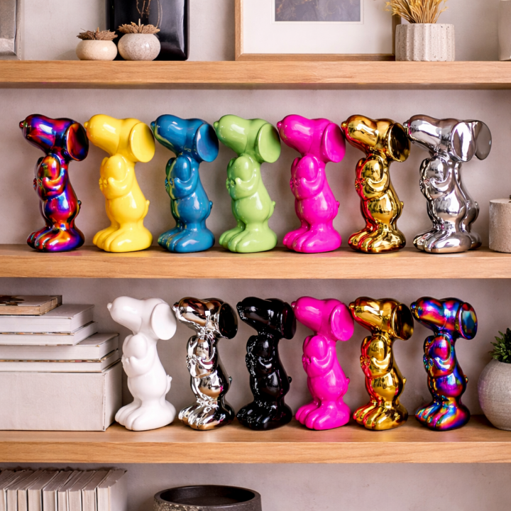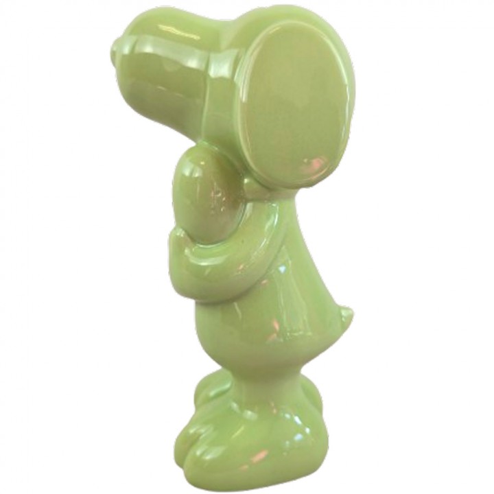 Cette statuette céramique verte complète parfaitement les modèles Snoopy jaune pastel, bleu pétrole et irisé holographique. Quatre coloris, quatre ambiances, une même silhouette — un ensemble décoratif cohérent et immédiatement identifiable.