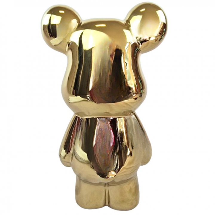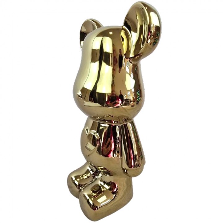 Ce n'est pas une peinture dorée. C'est une finition céramique chromée miroir — l'environnement s'y reflète, les formes s'y déforment selon l'angle. Un effet impossible à reproduire avec une dorure classique. Cette sculpture ours design entre directement dans la catégorie premium de la collection.