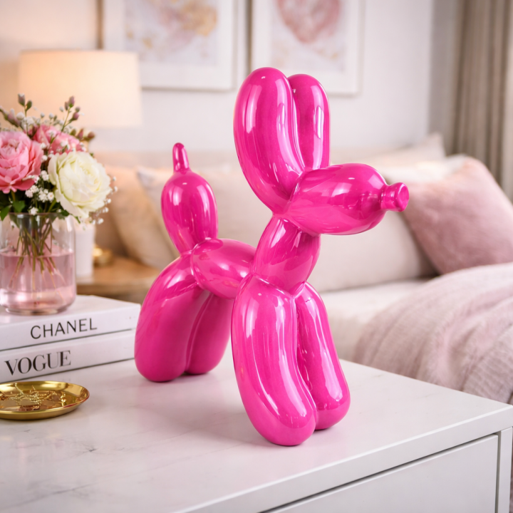 Dans un intérieur aux tons neutres — blanc, gris, beige, lin — cette statuette chien ballon rose fuchsia crée un point de couleur central immédiat. Elle n'a pas besoin d'être grande pour s'imposer : le fuchsia à 27 cm fait le même travail qu'une pièce bien plus volumineuse dans un coloris discret. C'est l'avantage des couleurs saturées — elles occupent l'espace visuellement bien au-delà de leurs dimensions réelles.