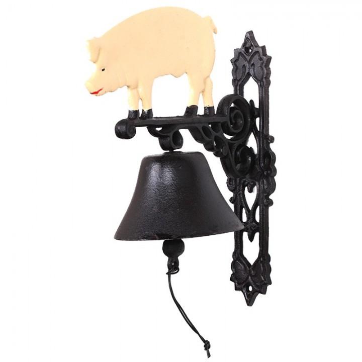 Découvrez cette magnifique cloche de porte en fonte, représentant un cochon plein de charme. Cette cloche murale rustique unit fonctionnalité et décoration murale vintage. Parfaite comme cloche de jardin en fonte, son poids de 2,8 kg témoigne d'une cloche décorative en fonte robuste et durable.