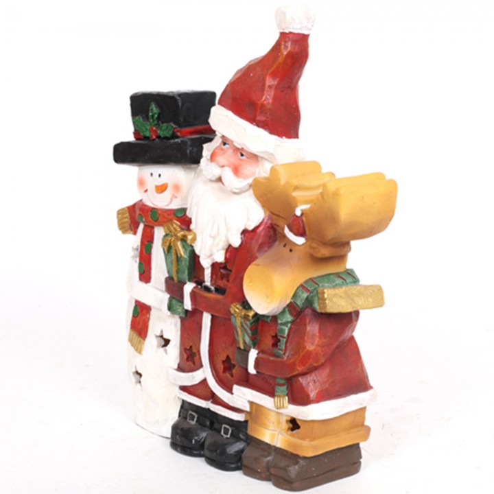 Cette lampe décorative en résine met en scène un trio festif : Père Noël, bonhomme de neige et élan. Ses dimensions de H. 23 x L. 20 x l. 11 cm et son poids de 1.2 kg créent une ambiance chaleureuse immédiate.